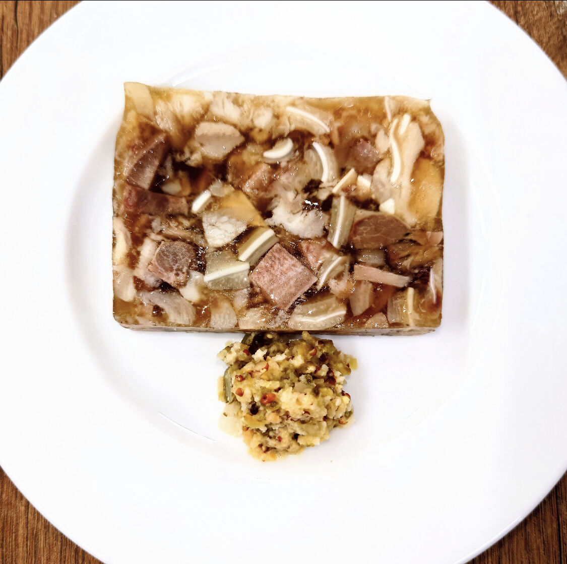 フランスの伝統料理。豚足と豚耳、舌をじっくりと煮込みテリーヌ型に詰め冷やし固めています。ピクルスやケッパーを使ったグリビッシュソースと一緒にどうぞ。